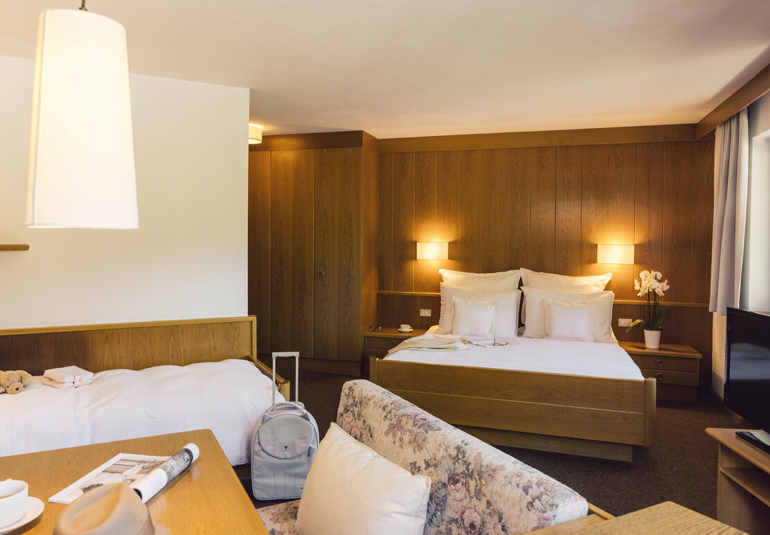 39 m² - Großzügiges Mehrbettzimmer mit Wohnbereich und Zusatzzimmer, Dusche/WC, Pure Herbs - Pflege mit der Kraft natürlicher Alpenkräuter, Haarfön, Telefon, Safe, Couch-Sitzgruppe, Flat Screen TV, kostenfreies WLAN, Radio, Infokanal, und größtenteils geräumigem Balkon.